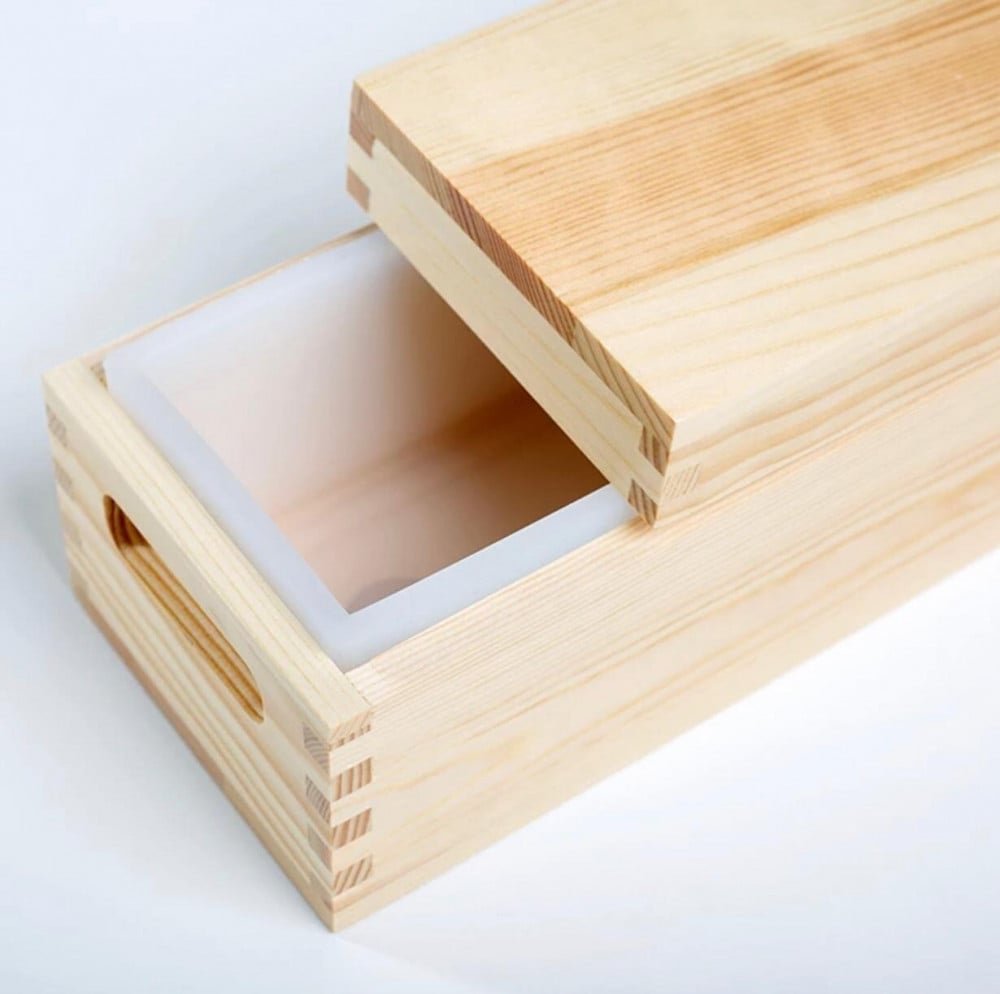 قالب للصابون سعته 2200 كجم مكون من 3 قطع قالب من الخشب و قالب من السيليكون المرن العالي الجوده وغطا من الخشب